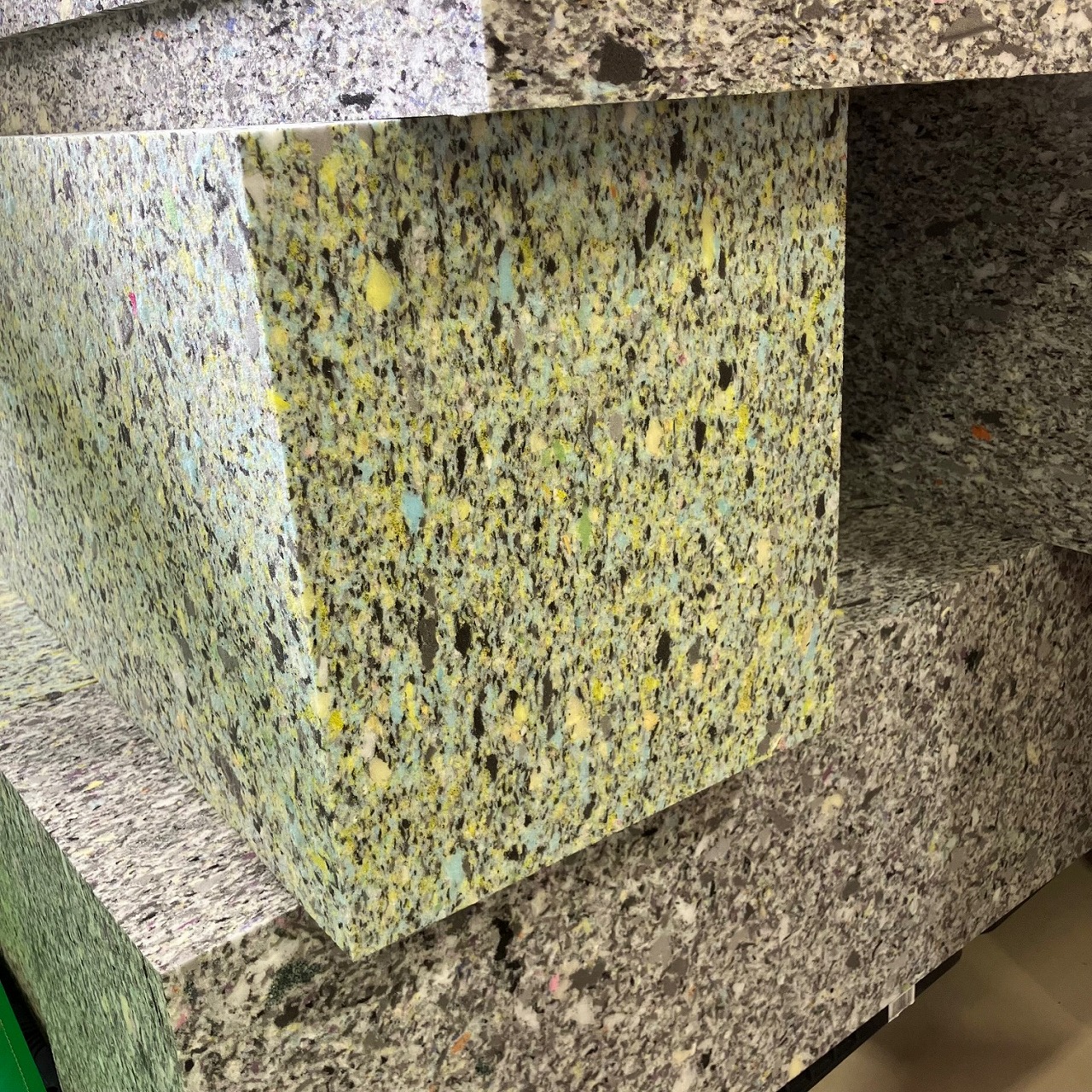 端材を細かく粉砕して、接着剤を混入し再圧縮したリサイクルウレタンです。