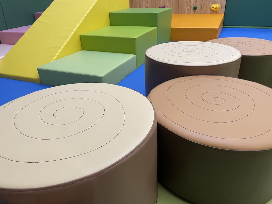 ボールプールの周囲には、年輪をモチーフにした特製クッションを製作しました。