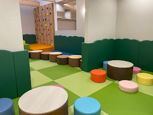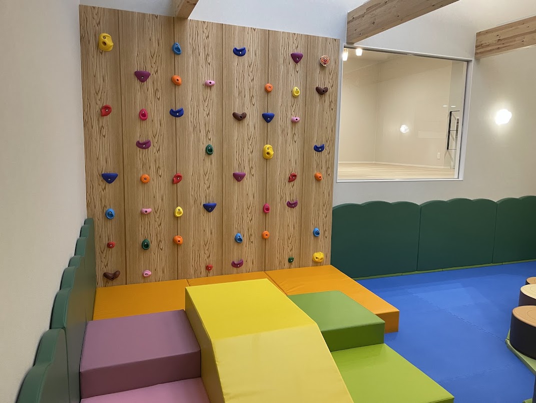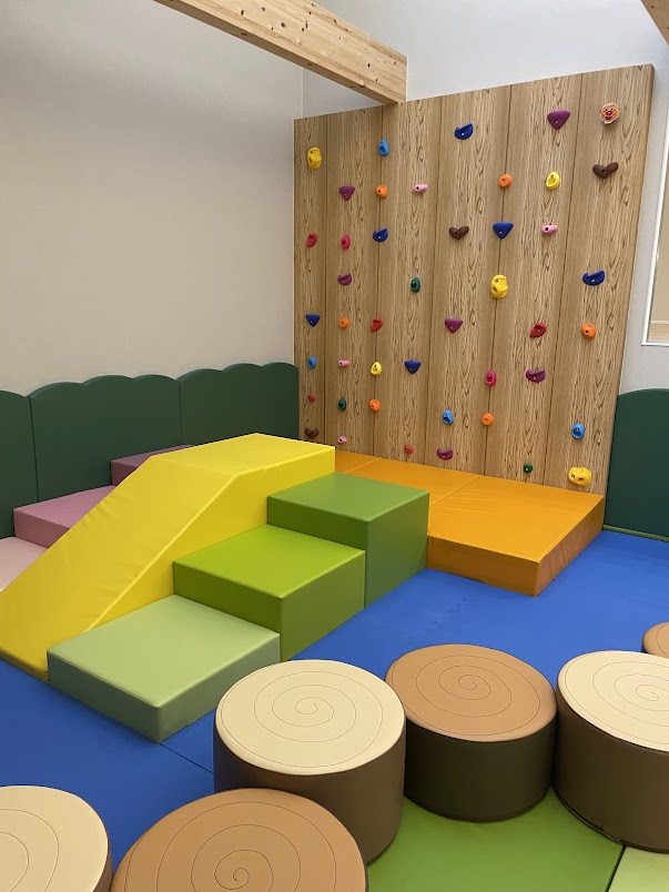 ボルダリング、ボールプール、すべり台、年輪クッション、緑のモクモク壁面、地域に寄り添った配色。