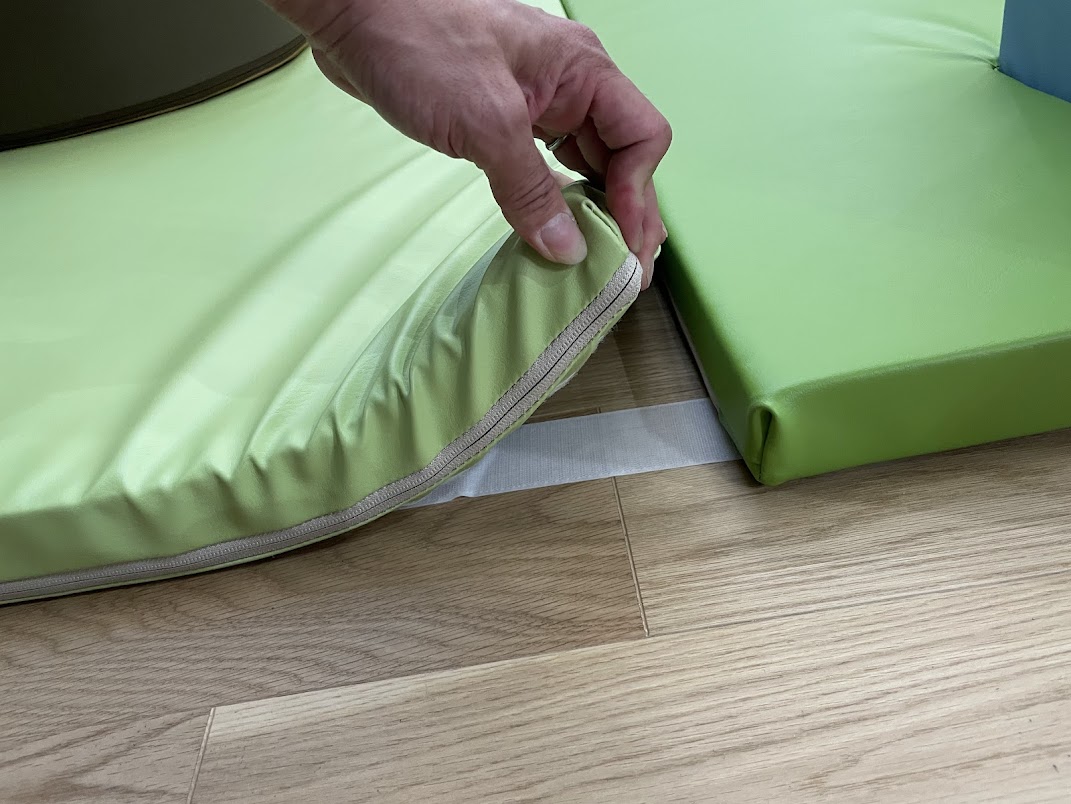 マットと床面は強力なテープでしっかりと固定し、ズレや浮きを防ぐことで転倒のリスクを軽減しています。