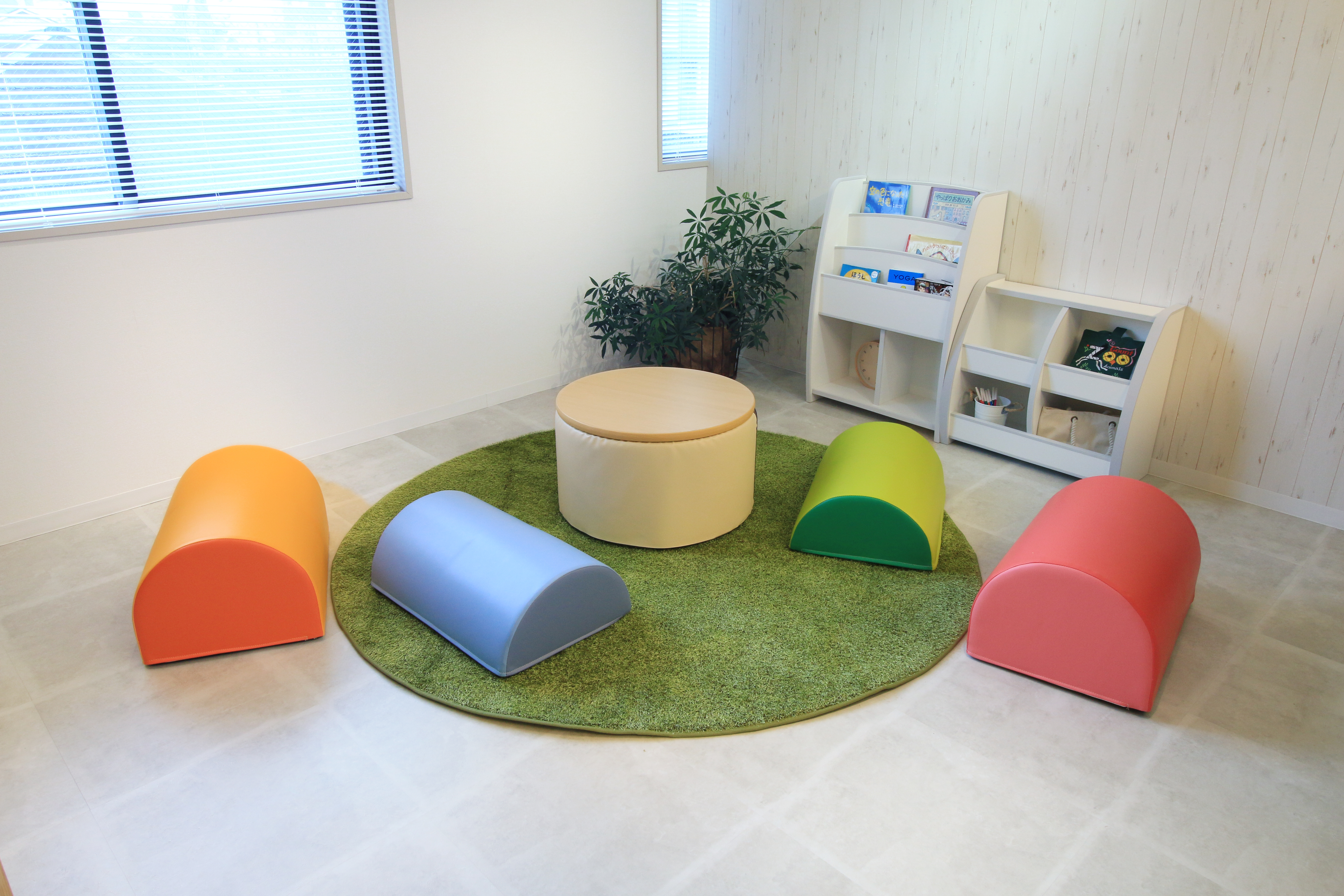 (内容:テーブル&カラーベンチ小 2台・カラーベンチ大 2台・絵本ラック・おもちゃラック・芝生ラグ)