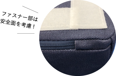 お子さまが遊ぶものだからこそ設計において安全性や耐久性を重視しています。たとえば、ファスナー部は安全面を考慮して、カバーで隠れるように設計。もちろん、縫製・製作は国内で行っておりますので仕上がりにも自信があります。