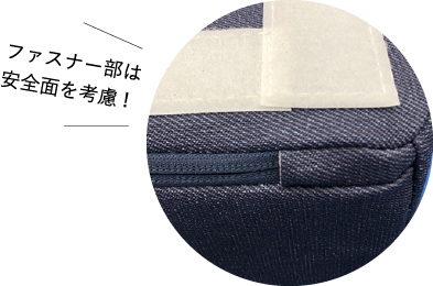 お子さまが遊ぶものだからこそ設計において安全性や耐久性を重視しています。たとえば、ファスナー部は安全面を考慮して、カバーで隠れるように設計。もちろん、縫製・製作は国内で行っておりますので仕上がりにも自信があります。